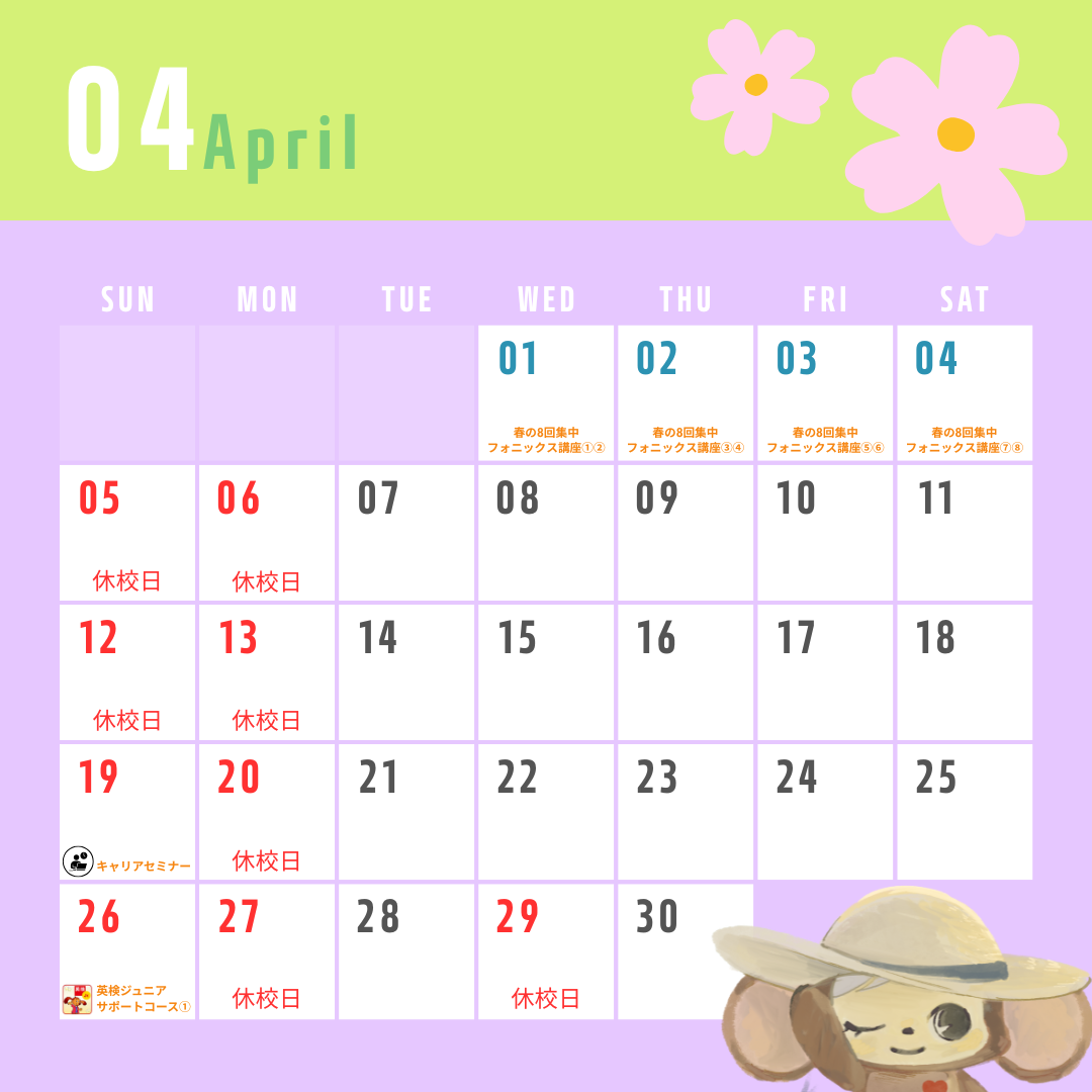 ・4/1(水)-4(土)は春の8回集中フォニックス講座を行います