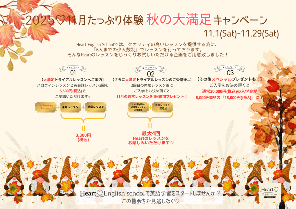 ハロウィンレッスンと英会話レッスン2回を、3,300円(税込)でご受講いただけます📚