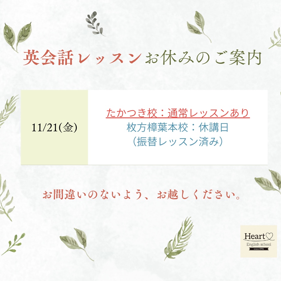 ホーム > お知らせ > 休校日のお知らせ🍁 NEWSお知らせ 休校日のお知らせ🍁 2025.11.20 お知らせ 上記の通り、スクールのスケジュールをお伝えします 11/21(金) 枚方樟葉本校 →休講日(振替レッスン済み) たかつき校 →通常通りレッスンを行います💝 お間違いのない様お越しくださいませ ———————————————— 大阪高槻・枚方の英会話・英語スクール Heart English School (ハートイングリッシュスクール) TEL:0120-836-8595 【くずは本校】 〒573-1122 大阪府枚方市西船橋2-7-5-103 【たかつき校】 〒569-0072 大阪府高槻市京口町6-4 SEND COMMENTS コメントをキャンセルコメントを投稿するにはログインしてください。 前の記事へ くずは本校 たかつき校