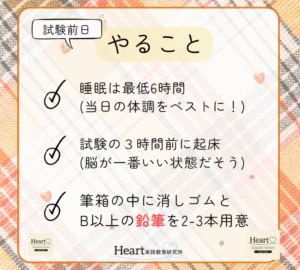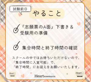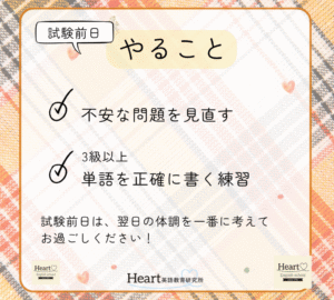 ホーム > 英検ブログ > 見た👀方が絶対🉐☝️明日の『試験前日の準備』を先にお伝えします! STEP TEST英検ブログ 見た👀方が絶対🉐☝️明日の『試験前日の準備』を先にお伝えします! 2025.10.02 英検ブログ さあ、いよいよ10/4(土)の英検本試験まで、後残すところ2日となりました🌟 明日は準備をする日なので、一生懸命に勉強できるのは、今日が最後です🔥 試験前日を有意義に過ごすために、「明日すること」を先にお伝えしておきますね! 各校の試験時間は、9月号新聞でご確認ください! ———————————————— 大阪高槻・枚方の英会話・英語スクール Heart English School (ハートイングリッシュスクール) TEL:0120-836-8595 【くずは本校】 〒573-1122 大阪府枚方市西船橋2-7-5-103 【たかつき校】 〒569-0072 大阪府高槻市京口町6-4 SEND COMMENTS コメントをキャンセルコメントを投稿するにはログインしてください。 前の記事へ くずは本校 たかつき校